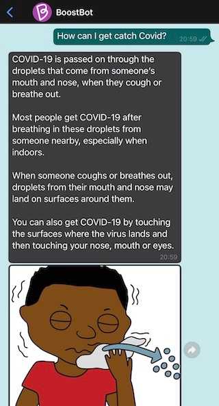The WhatsApp chatbot service uses Machine Learning to answer questions, and returns optimised Boost content from the same system that powers the web app.